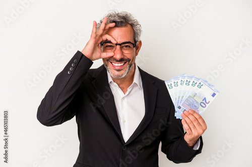 Middle age business man holding bills isolated on blue background excited keeping ok gesture on eye.