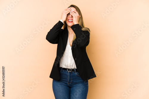 Middle age business woman isolated covers eyes with hands, smiles broadly waiting for a surprise.