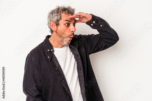 Middle age caucasian man isolated on white background looking far away keeping hand on forehead.