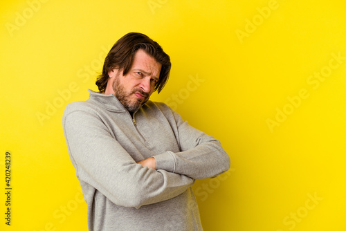 Middle age caucasian man isolated on yellow background frowning face in displeasure, keeps arms folded.