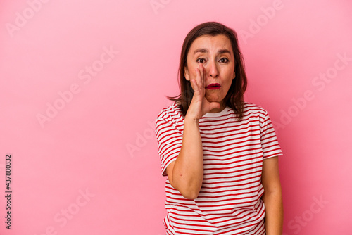 Middle age caucasian woman isolated on pink background is saying a secret hot braking news and looking aside