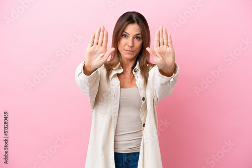 Middle age caucasian woman isolated on pink background making stop gesture and disappointed