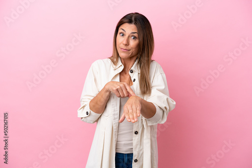 Middle age caucasian woman isolated on pink background making the gesture of being late