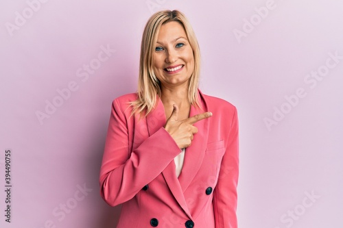 Middle age caucasian woman wearing business jacket cheerful with a smile of face pointing with hand and finger up to the side with happy and natural expression on face