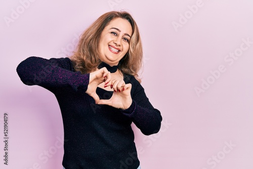 Middle age caucasian woman wearing casual clothes smiling in love doing heart symbol shape with hands. romantic concept.