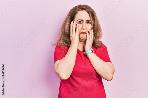 Middle age caucasian woman wearing casual clothes tired hands covering face, depression and sadness, upset and irritated for problem