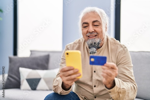 Middle age grey-haired man using smartphone and credit card sitting on sofa at home