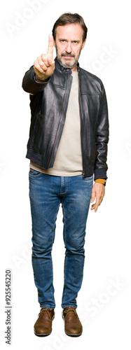 Middle age handsome man wearing black leather jacket Pointing with finger up and angry expression