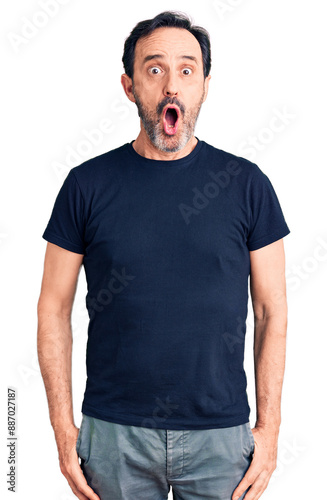 Middle age handsome man wearing casual t-shirt afraid and shocked with surprise expression, fear and excited face.