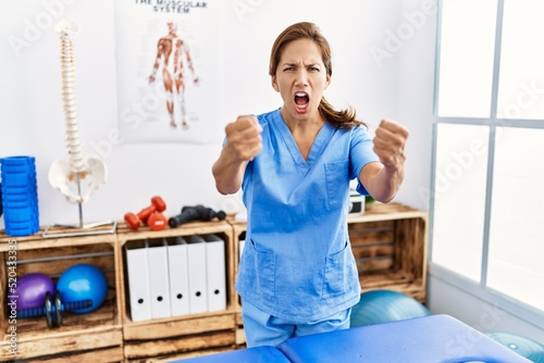 Middle age hispanic physiotherapist woman working at pain recovery clinic angry and mad raising fists frustrated and furious while shouting with anger. rage and aggressive concept.