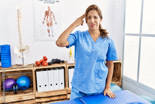 Middle age hispanic physiotherapist woman working at pain recovery clinic shooting and killing oneself pointing hand and fingers to head like gun, suicide gesture.