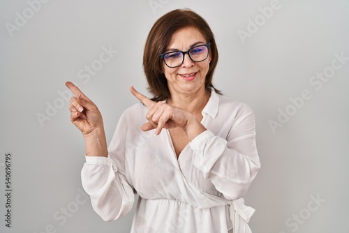Middle age hispanic woman standing over isolated background smiling and looking at the camera pointing with two hands and fingers to the side.