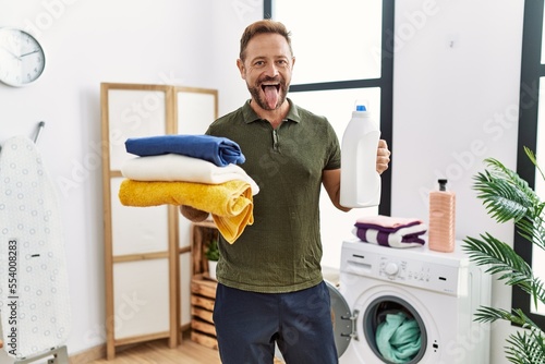 Middle age man holding clean laundry and detergent bottle sticking tongue out happy with funny expression.