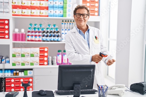 Middle age man pharmacist scanning pills bottle at pharmacy