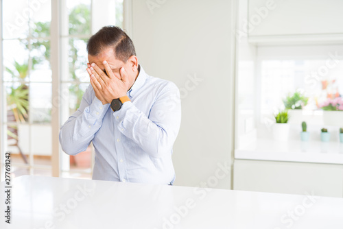 Middle age man sitting at home with sad expression covering face with hands while crying. Depression concept.