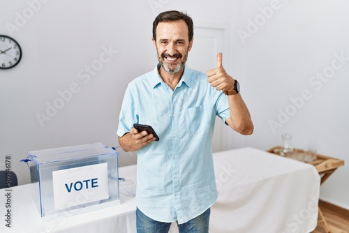 Middle age man with beard at political election using smartphone smiling happy and positive, thumb up doing excellent and approval sign