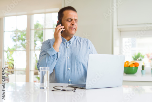 Middle age man working with laptop and using smartphone