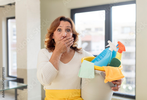middle age pretty woman covering mouth with a hand and shocked or surprised expression. housekeeper concept