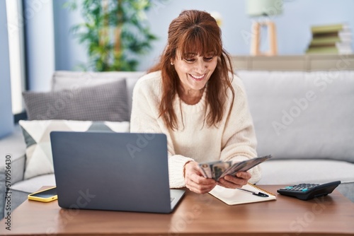 adult, mature, elderly, woman, person, beautiful, caucasian, female, attractive, happy, confident, smile, smiling, sitting, sofa, laptop, computer, working, contraption, device, using, cyberspace, online, technology, money, business, investment, finance, payment, paying, account, accounting, calculating machine, dollar, banknote, counting, bill, paper, home, house, apartment, indoor, indoor, interior, living room, room, background
