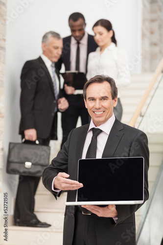 business, businessperson, businessperson, businessman, businesswoman, cheerful, computer, confidence, contemporary, expertise, finance, global business, happiness, holding, indoor, intelligence, laptop, lifestyle, looking, man, occupation, office, office worker, portrait, professional occupation, act, showing, smiling, standing, teamwork, technology, togetherness, trader, wireless technology, woman