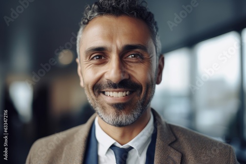 Middle aged businessman of arab ethnicity smiling in a modern office and looking at camera