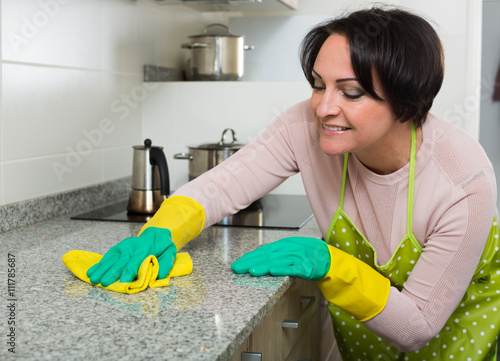 woman, dusting, surface, furniture, people, person, apron, female, brunet, mature, maid, adult, casual attire, smiling, relaxed, portrait, european, caucasian, american, household, comfortable, happy, satisfied, routine, chore, supply, charwoman, service, duty, work, accurate, top, furnished, rag, rubber, glove, shelving, polish, table, kitchen, home, domestic, interior, 50s