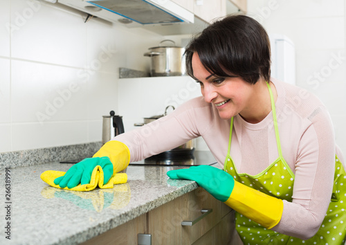 Middle aged female dusting kitchen top