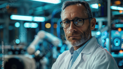 Middle Aged Male Engineer using glasses standing in front of a picture of Monitoring and Analyzing Conditions in the background of a Modern Electronics Factory with Automatic Robots Working