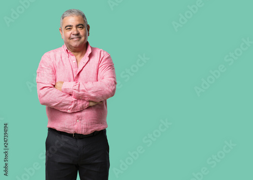 Middle aged man crossing his arms, smiling and happy, being confident and friendly