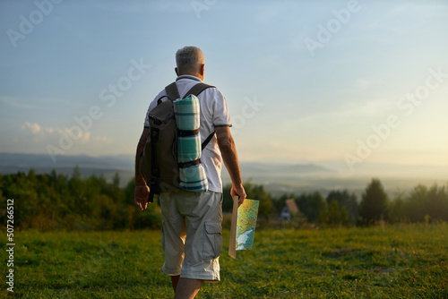 Middle aged man walking on green meadow, while hiking in mountains. Back view of adult male traveler holding map, while backpacking on rural area in summer, with copy space. Concept of backpacking.