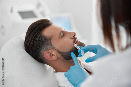 professional, middle, client, man, cosmetologist, salon, mature, woman, glove, procedure, aged, beautician, beard, beauty, male, patient, health, injection, adult, clinic, skin, caucasian, therapy, closeup, face, treatment, doctor, cosmetology, syringe, aesthetic, cosmetic, needle, surgeon, collagen, person, surgery, wrinkle, lifting, rejuvenation, filler, lift, skilled, plastic, filling, health care, tranquil