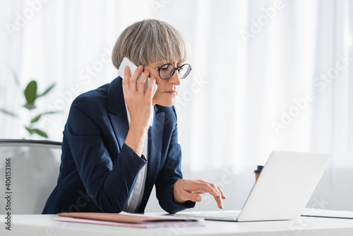 computer, beautiful, business, caucasian, technology, corporate, suit, woman, call, mobile phone, communication, conversation, mobile, phone, talk, laptop, professional, job, desk, indoor, attractive, goggles, executive, leadership, mature, workplace, successful, businesswoman, use, device, smartphone, copy space, one person, middle-aged