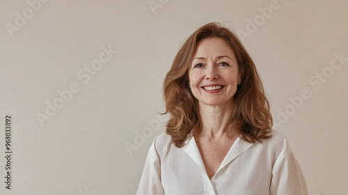 Middle aged woman smiling isolated from a copyspace background. Inclusivity conceptual image