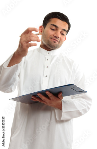 businessman, writing, folder, clipboard, pen, communication, man, male, arab, diversity, person, people, robe, tunic, garment, clothing, dress, ruby, ethnic, mixed race, religion, muslim, faith, model, culture, beard, work, working, white background