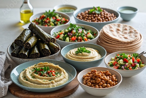 Middle Eastern Food, Hummus, Dolma, Tabouli, Pita Bread, Mezze Platter, Food Photography, Close Up, Healthy Food, Vegetarian, Mediterranean Cuisine, Authentic Cuisine