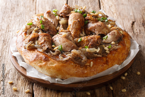 Middle Eastern meal of chicken with sumac, pine nuts and onions on a flat bread closeup. horizontal