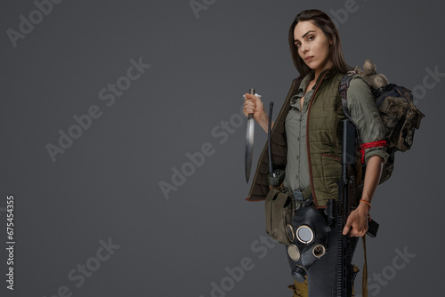 Middle Eastern woman descent in post-apocalyptic survival gear, brandishing a dagger on a gray backdrop, showcasing her determination to survive