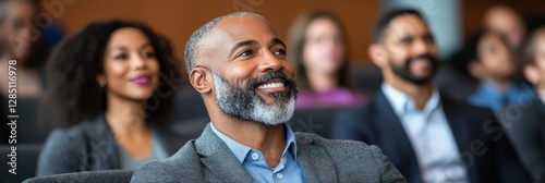 Middle-Aged Black Man with Graying Beard Smiling at Inspiring Speech in Professional Audience of Diverse Men and Women in Business Attire