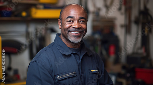smiling, portrait, middle-aged, african american, car, mechanic, workshop, professional, automotive, repair, tool, equipment, industry, service, skilled, hard-working, garage, vehicle, friendly, technician