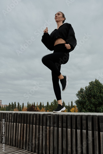 Middle-aged blonde caucasian woman athlete lady wears black tracksuit, in city park run. Workout sport outdoors.