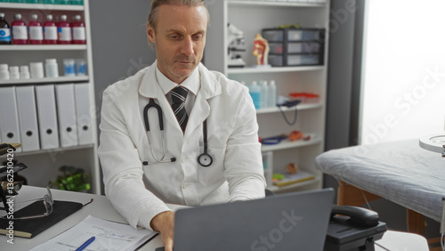 Middle-aged caucasian man working in a clinic room, wearing a white coat with a stethoscope, concentrated on a laptop among medical supplies, suggesting a healthcare setting.