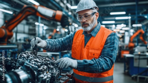 Middle-aged engineer specializing in automotive engines performing meticulous quality inspections in a bustling factory environment,generative ai