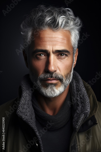 man, middle-aged, photogenic, beard, bearded, portrait, face, person, studio, grey, casual attire, copy space, determined, mysterious, secret, facial, facial hair, head shot