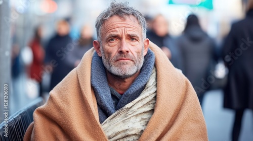 middle-aged, homeless, man, weary, expression, sit, alone, city, bench, wrapped, old, tattered, blanket, bustle, past, soft, sharpened, behind, him, contrast, social, isolation, copy space, right, enhance, composition, balance, high-quality, inspiration, style, concept, professional, unique, detail, background, abstract