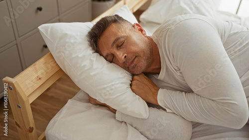 Middle-aged man sleeping peacefully in his bedroom, resting on a white pillow and dressed in light sleepwear.