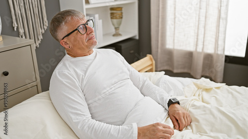 man, middle-aged, goggles, white, shirt, relaxing, bed, modern, bedchamber, indoor, adult, senior, comfortable, home, interior, casual attire, lifestyle, resting, house, male, furniture, peaceful, cosy, lighting, daytime, decor, pillow, contemplative, alone, serenity, quiet, window, looking, aged, mature, photogenic, wellness, solitude, calmness, comfort, stylish, domestic, health, tech, watch, accessory, pensive