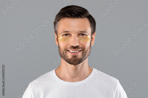 Middle-aged man with golden patches under eyes from wrinkles