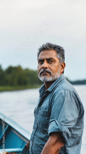 Middle-aged South Asian man remotely piloting an autonomous cargo boat along a tranquil riverbank