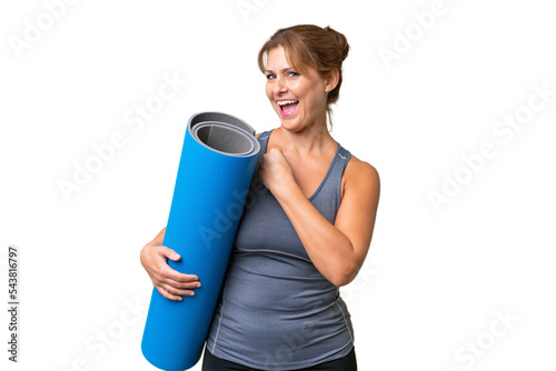 Middle-aged sport woman going to yoga classes while holding a mat over isolated background celebrating a victory