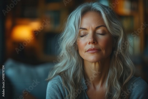 middleaged woman in a peaceful living room meditating with eyes closed surrounded by calming decor and soft light embodying a sense of selfcare mindfulness and mental wellbeing